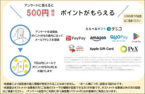 オストメイトのパブリックトイレ利用に関するアンケート調査の件 以下のようにTOTO株式会社様からWebアンケートへの協力依頼がありました。可能ならぜひ協力をお願いします。 回答期限:2025年9月から2025年12月末 ※回答数が上限に達し次第、受付を終了します なお、TOTO株式会社様はトイレや浴室など水まわり製品を開発・製造する企業です。 TOTOより WEBアンケートご協力のお願い オストメイトのパブリックトイレ利用に関する調査 TOTO株式会社では、一人でも多くの人が使いやすいパブリックトイレの実現を目指し、 調査・研究を続けています。 今年度は、オストメイト当事者の方のパブリックトイレ 利用に関する利用実態やニーズを把握する調査を実施します。 パブリックトイレについて、あなたの使い方やお考えをお聞かせください。 頂いたご意見は、今後のパブリックトイレづくりに 活かしていきたいと考えています。 何卒ご協力の程、よろしくお願い申し上げます。 <アンケート概要> ◎内容:パブリック(外出先)トイレでのストーマ装具(パウチ)の処理に関することなど ◎所要時間:5分から10分程度 ◎回答期限:2025年9月から2025年12月末 ※回答数が上限に達し次第、受付を終了します <アンケート回答方法> 2次元コードを読み込み(または以下のURLに アクセスして)、アンケートフォームからご回答ください。 https://docs.google.com/forms/d/e/1FAIpQLScV24l19Ka-obTRGAlzyPu5dKVjlV7o5g0wnK0e5cZfo9H0kg/viewform ************************* デジコ アンケートに答えると500円相当のデジタルギフトがもらえる 受取ったデジタルギフトは、いつものポイント・ギフト券へ簡単に交換出来ます。 STEP1: 2次元コードを読み込み、アンケートに回答します。 STEP2: 回答を送信後、画面に表示されるポイント付与の案内に沿って、 お客様のメールアドレスをご登録ください。 STEP3: アンケートに回答いただいてから7日以内にメールでポイント付与のURLをお届けします。 注意事項 ・本調査により回答者の個人情報が特定されることはありません。 ・お一人様につき、回答は1回のみです。 ・本調査はオストメイト当事者の方(ご自身のストーマの種類が回答できる方)が対象です。 オストメイト当事者以外の方の回答はご遠慮ください。 ・アンケート回答やご利用に伴う通信費(パケット代)はお客様のご負担となります。 ※本調査についてのお問い合わせは TOTO 調査 実施担当者【 ml_totoud_713@jp.toto.com 】 まで お願いいたします 。 |