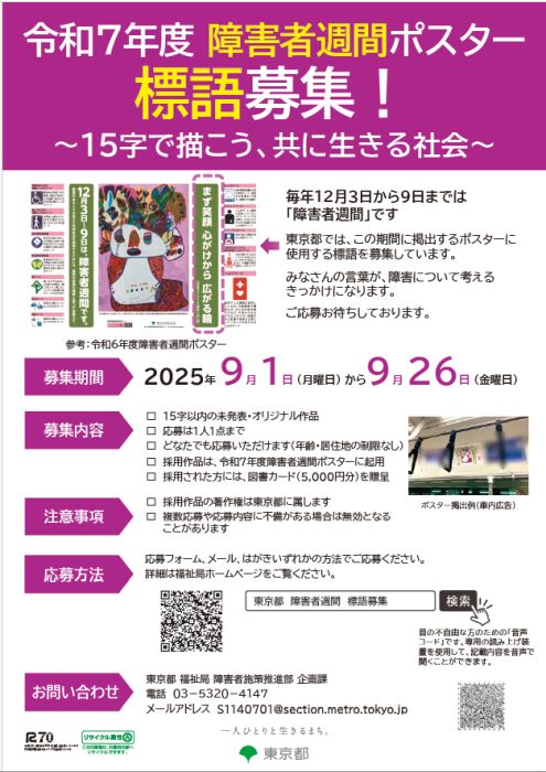 障害者週間ポスターの標語募集(東京都福祉局 企画課からのお知らせ) https://www.fukushi.metro.tokyo.lg.jp/about/soshiki/syougai/kikaku/oshirase/hyogoboshu 令和7年度障害者週間ポスターの標語を募集します 障害者を取り巻く問題について、理解をより一層深めるため、東京都が作成する「障害者週間ポスター」に使用する標語を募集します。 あなたのメッセージが、障害や障害のある方々について皆で考えるきっかけになります。 ぜひご応募ください。 募集内容 文字数は、15字以内です。 未発表でオリジナルのもの1点に限ります。 どなたでもご応募いただけます。(年齢・居住地の制限なし) 最も優れた1点を、令和7年度の障害者週間ポスターの標語として使?します。 応募?法 下記応募フォームよりご応募ください。 https://logoform.jp/form/tmgform/1145937 電?メール?は郵送(はがき)でも受け付けます。 応募に際しては、郵便番号、住所、氏名、電話番号またはFAX番号を明記してください。 職業又は学校名(学年)の記入は任意です。 (必要事項が明記されていないものは無効となりますのでご注意ください。) なお、学校単位で応募する場合は、各学校で取りまとめの上、メールにより応募してください。 ○電子メールの場合の送付先 S1140701(at)section.metro.tokyo.jp ※迷惑メール対策のため、メールアドレスの表記を変更しています。 お?数ですが、(at)を@に変えて送信してください。 ※件名は、「障害者週間ポスター応募」としてください。 ○郵送(はがき)の場合の送付先 〒163?8001 東京都新宿区?新宿2?8?1 東京都庁第?本庁舎31階 福祉局 障害者施策推進部 企画課 社会参加推進担当 宛て 注意事項 採?した標語の著作権は東京都に帰属します。 複数応募や応募内容に不備がある場合は無効となることがあります。 応募期間 令和7年9月1日から同年9月26日消印有効】 選考発表 採?者(1名)には、記念品(図書カード5千円分)を贈呈します。 なお、複数の応募者が同?の標語で応募し、採?された場合には、抽選により記念品贈呈者を決定します。 選考結果は採?者に直接連絡します。 募集チラシ 令和7年度障害者週間ポスター標語募集チラシ(PDF:1,050KB) https://www.fukushi.metro.tokyo.lg.jp/documents/d/fukushi/2025-08-14-161504-835 その他 個人情報は、第三者に漏れることのないよう適正に取扱い、本事業の目的以外で使用する場合は、必ず本人の同意を得ることとします。 お問い合わせ 福祉局 障害者施策推進部 企画課 社会参加推進当 住所 〒163?8001 新宿区西新宿2ー8ー1 東京都庁第1本庁舎31階 電話 03-5320-4147 FAX 030?5388?1413 電?メールアドレス S1140701(at)section.metro.tokyo.jp ※迷惑メール対策のため、メールアドレスの表記を変更しています。 障害者週間ポスターの標語募集(東京都福祉局 企画課からのお知らせ) https://www.fukushi.metro.tokyo.lg.jp/about/soshiki/syougai/kikaku/oshirase/hyogoboshu 令和7年度障害者週間ポスターの標語を募集します 障害者を取り巻く問題について、理解をより一層深めるため、東京都が作成する「障害者週間ポスター」に使?する標語を募集します。 あなたのメッセージが、障害や障害のある方々について皆で考えるきっかけになります。 ぜひご応募ください。 募集内容 ?字数は、15字以内です。 未発表でオリジナルのもの1点に限ります。 どなたでもご応募いただけます。(年齢・居住地の制限なし) 最も優れた1点を、令和7年度の障害者週間ポスターの標語として使?します。 応募?法 下記応募フォームよりご応募ください。 https://logoform.jp/form/tmgform/1145937 電?メール?は郵送(はがき)でも受け付けます。 応募に際しては、郵便番号、住所、氏名、電話番号またはFAX番号を明記してください。 職業又は学校名(学年)の記入は任意です。 (必要事項が明記されていないものは無効となりますのでご注意ください。) なお、学校単位で応募する場合は、各学校で取りまとめの上、メールにより応募してください。 ○電?メールの場合の送付先 S1140701(at)section.metro.tokyo.jp ※迷惑メール対策のため、メールアドレスの表記を変更しています。 お?数ですが、(at)を@に変えて送信してください。 ※件名は、「障害者週間ポスター応募」としてください。 ○郵送(はがき)の場合の送付先 〒163?8001 東京都新宿区?新宿2?8?1 東京都庁第?本庁舎31階 福祉局 障害者施策推進部 企画課 社会参加推進担当 宛て 注意事項 採?した標語の著作権は東京都に帰属します。 複数応募や応募内容に不備がある場合は無効となることがあります。 応募期間 令和7年9月1日から同年9月26日消印有効】 選考発表 採?者(1名)には、記念品(図書カード5千円分)を贈呈します。 なお、複数の応募者が同?の標語で応募し、採?された場合には、抽選により記念品贈呈者を決定します。 選考結果は採?者に直接連絡します。 募集チラシ 令和7年度障害者週間ポスター標語募集チラシ(PDF:1,050KB) https://www.fukushi.metro.tokyo.lg.jp/documents/d/fukushi/2025-08-14-161504-835 その他 個?情報は、第三者に漏れることのないよう適正に取扱い、本事業の目的以外で使用する場合は、必ず本